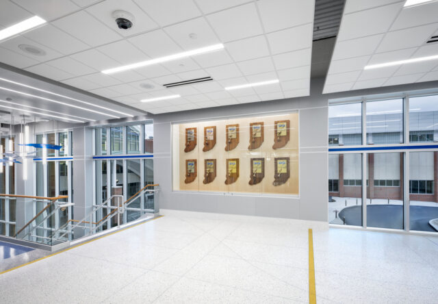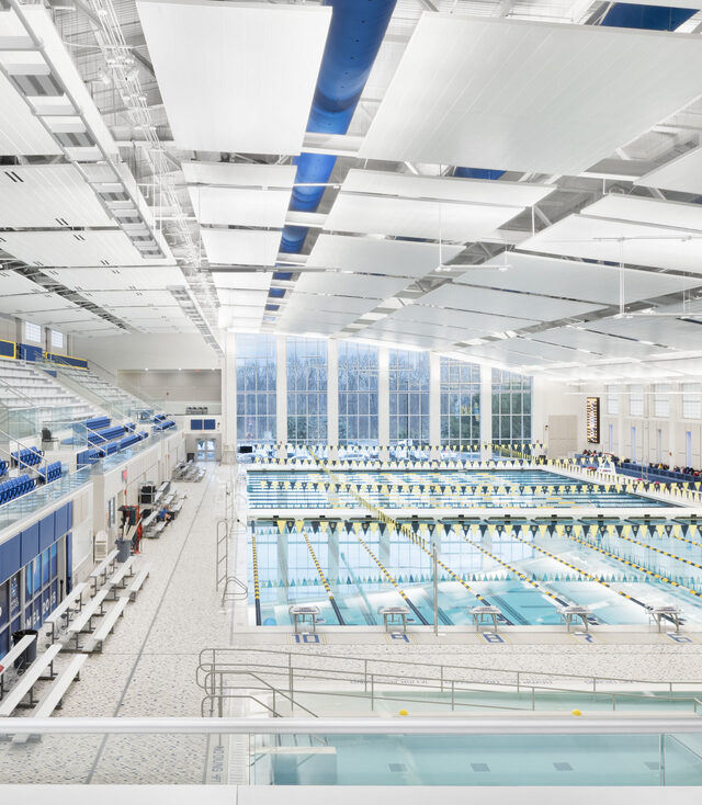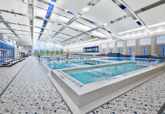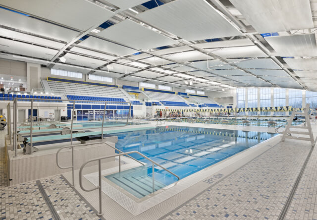 The addition also includes a large hydrotherapy pool with temperatures suited for students, athletes, staff and community use. A separate diving well with a one-meter diving platform and stands for beginning and experienced divers ensure greater flexibility for the 50-meter by 25-meter stretch pool. A variety of support spaces on both levels allows for spectator flexibility during competitions.